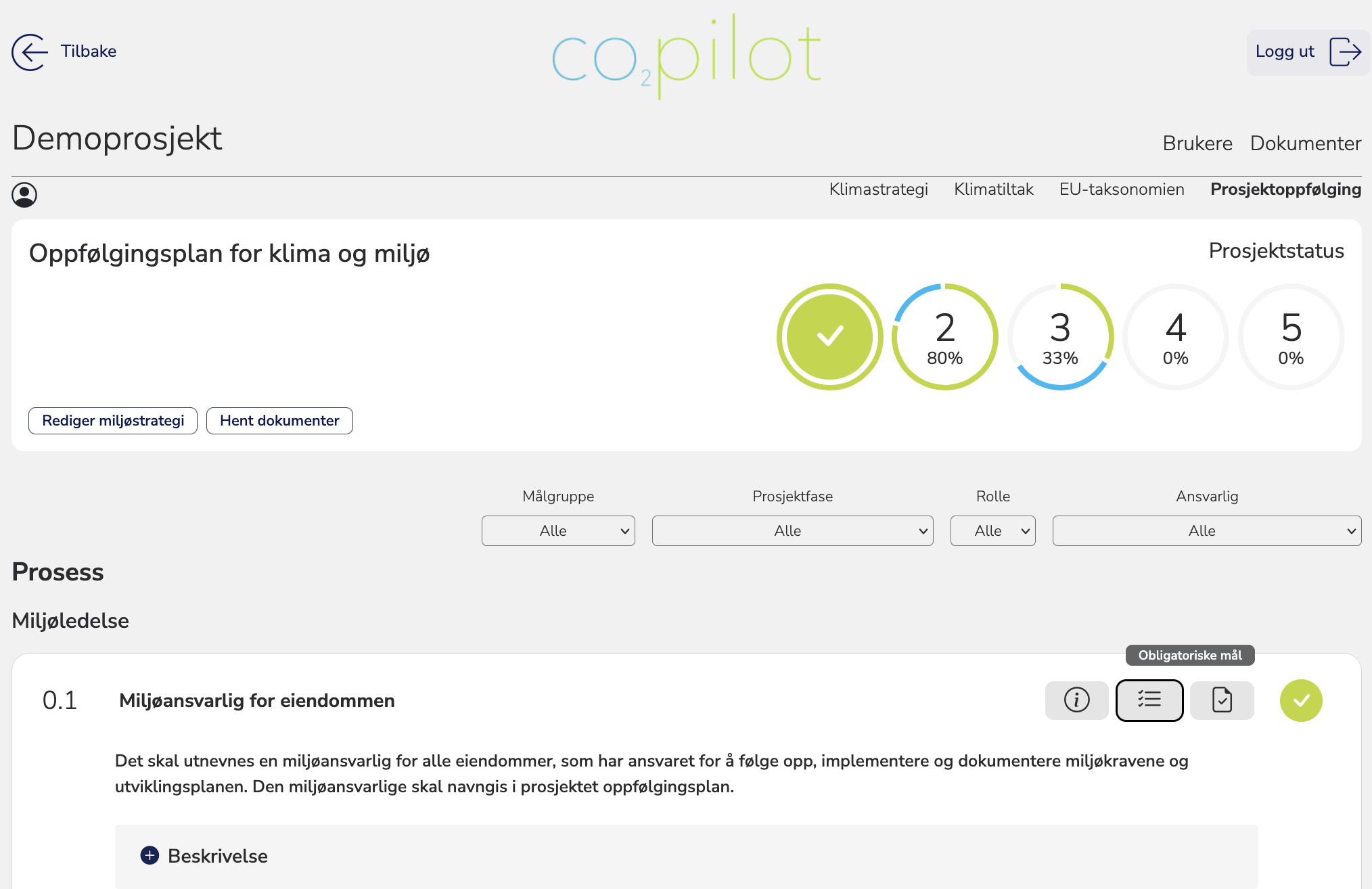 co2pilot tilbyr et digitalt arbeidsrom for å bygge og vedlikeholde miljømål, krav og kriterier. Mål kan baseres på vårt omfattende bibliotek, eller forfattes helt fritt. Strategi, aktiviteter, entreprisekrav, KPIer og dokumentasjon kan vedlikeholdes løpende, og hentes inn i et hvilket som helst prosjekt.